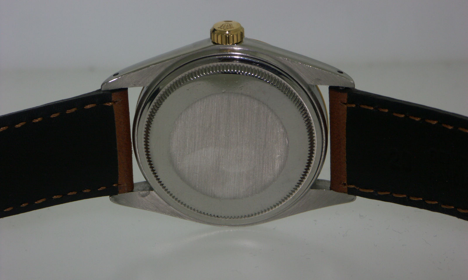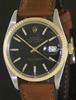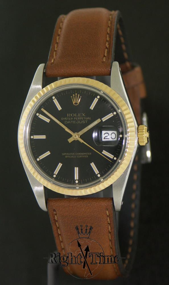 Rolex Oyster perpetual "Datejust". Rolex automatic COSC chronometer movement. Stainless steel case with 18kt fluted gold bezel. Black dial with gold tone hands and markers under a raised acrylic crystal. Tan chisel point cut-edge strap. Factory model 16030, circa 1987.