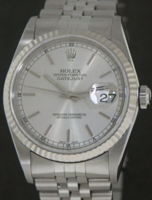 Rolex Oyster Datejust perpetual, stainless steel case and band, with 18kt white gold bezel, style 16234, like new condition with box and papers, 03/2003