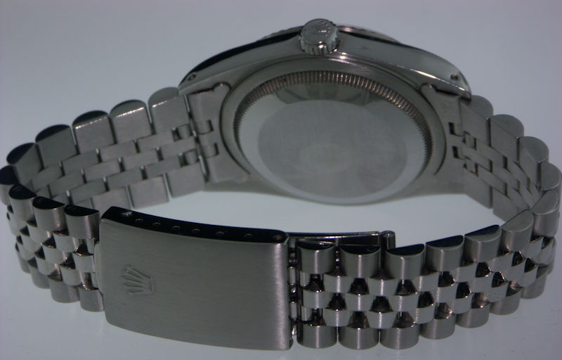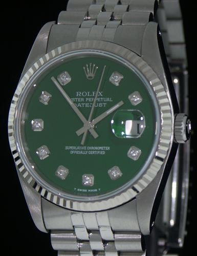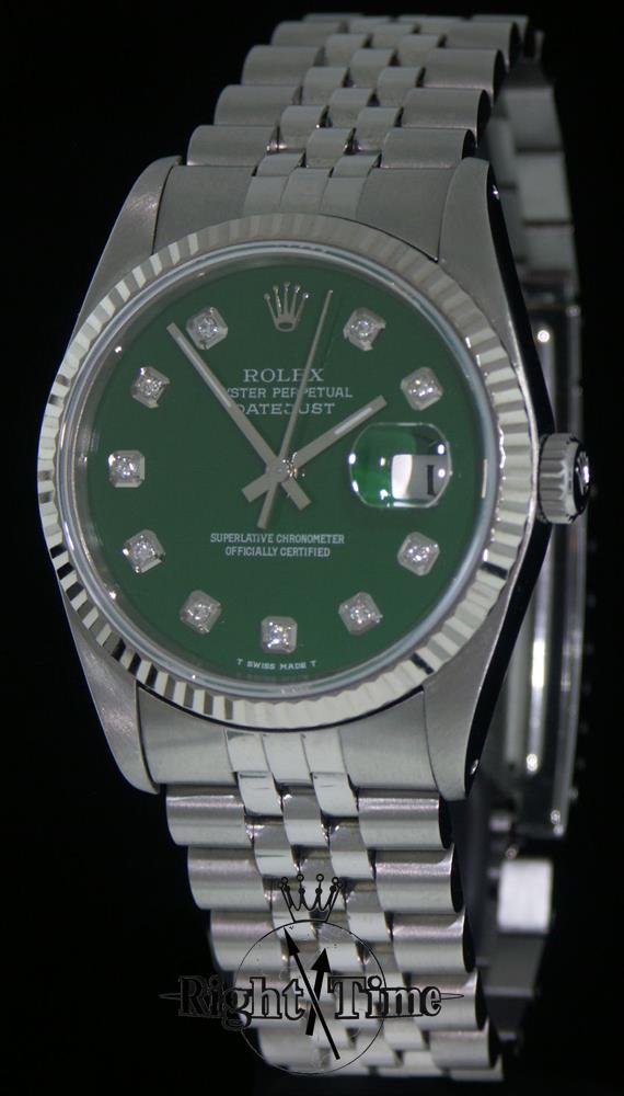 Rolex Oyster Datejust perpetual, style 16234. Solid stainless steel case and jubilee style bracelet. Genuine 18kt white gold fluted bezel. Modified green color dial with diamond markers. Swiss made Rolex Caliber 3135 automatic movement.