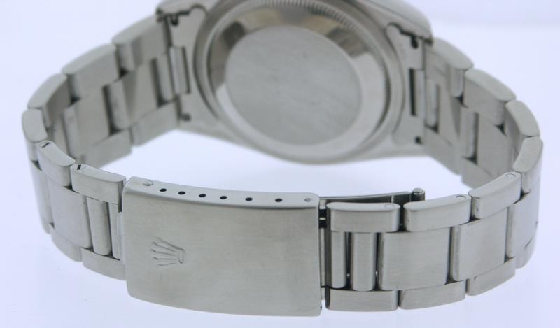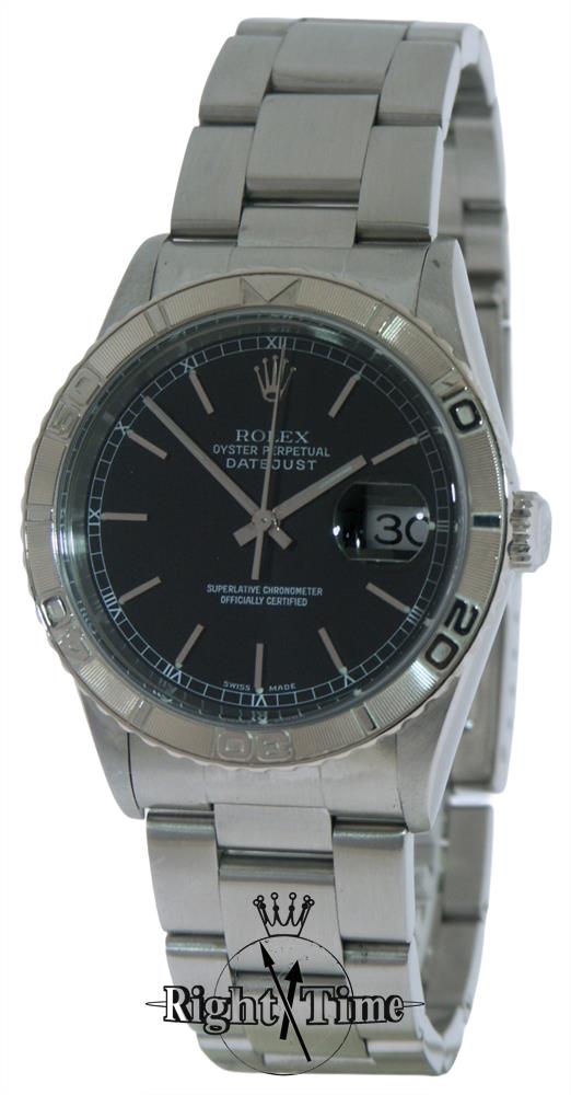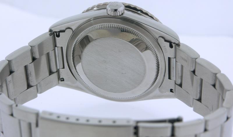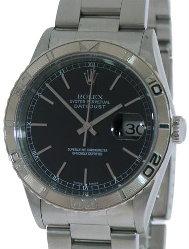 Rolex Datejust Oyster Perpetual Turn-O-Graph model 16264. Rolex Caliber 3135 automatic movement with COSC chronometer certification. Stainless steel case with 18kt white gold rotating bezel. Oyster style stainless steel bracelet. Sapphire crystal with magnifier. Black dial.