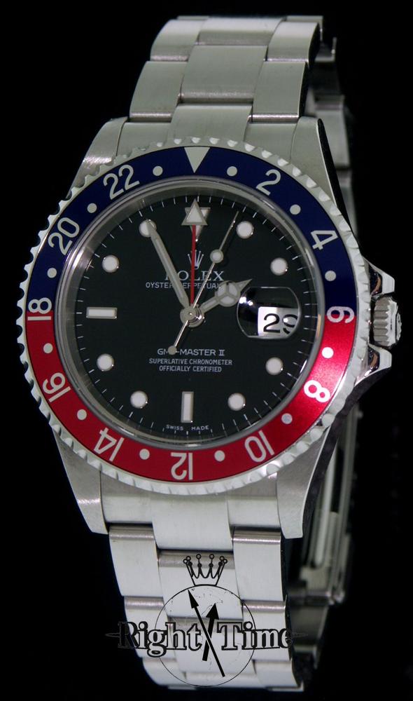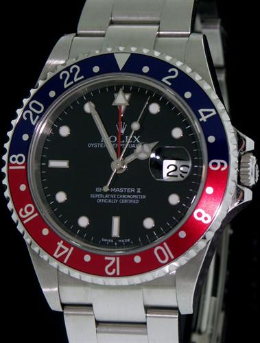 Rolex Model 16710 GMT-Master II dual time model with black dial, blue and red "Pepsi" rotating 24hr bezel, 31 jewels Rolex Cal. 3135 automatic movement, box and papers, 2009.