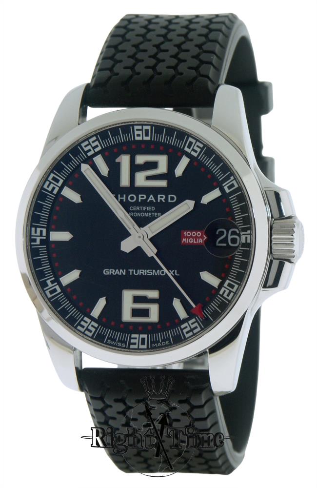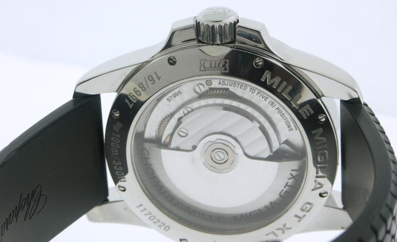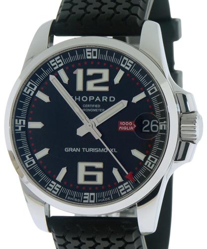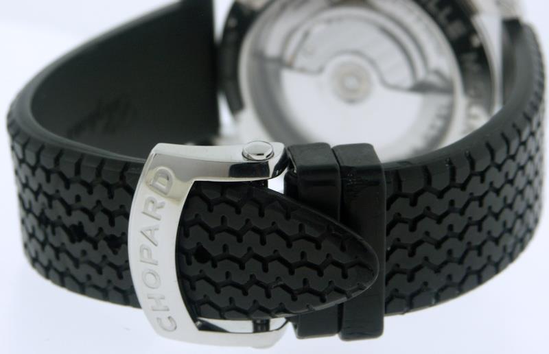 Chopard Mille Miglia Gran Turismo XL model 168997-3001. Swiss made automatic ETA Valgranges A07111 movement. Polished stainless steel case. Black dial with luminous hands and markers. Sapphire crystal with embedded bubble date magnifier. Black rubber strap with tire tread pattern. Water resistant to 100 meters.