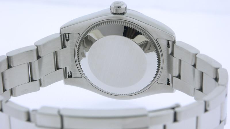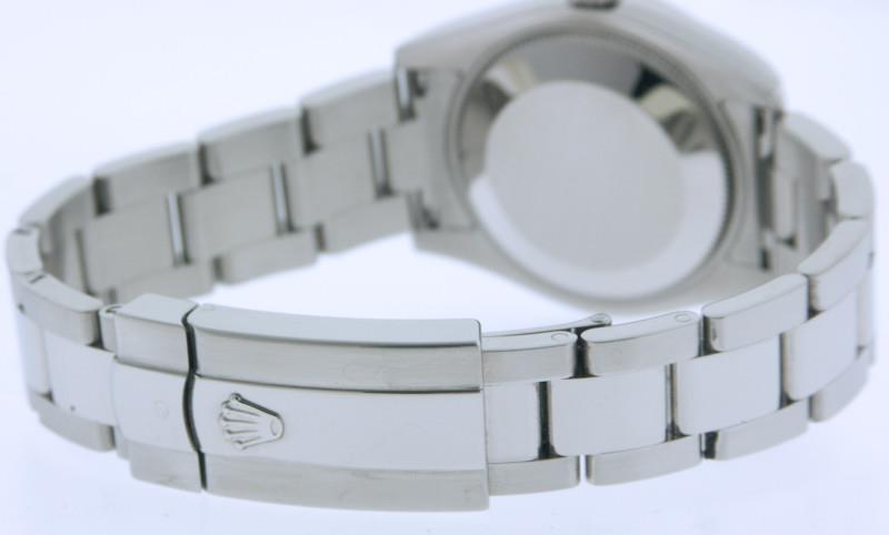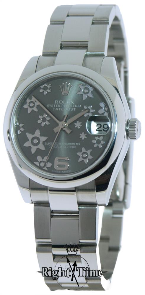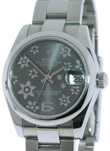 Rolex Lady 31 Datejust model 178240. All stainless steel case & Oyster style bracelet with combination satin/polished finish. Dark Rhodium applied floral motif and Arabic numerals, scratch resistant sapphire crystal with bubble date magnifier. Rolex Calibre 2235 automatic movement.