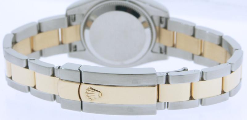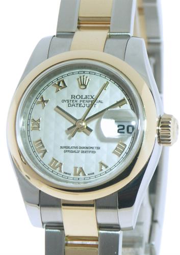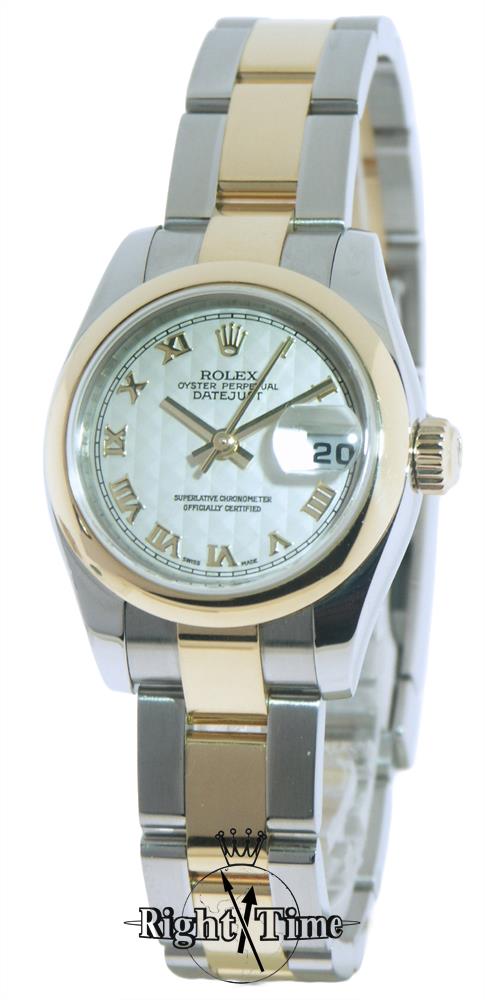 Ladies Rolex DateJust 179163 Swiss Automatic, 18kt yellow gold bezel, ivory Roman dial, 18kt gold and steel oyster style bracelet, with new style Rolex clasp