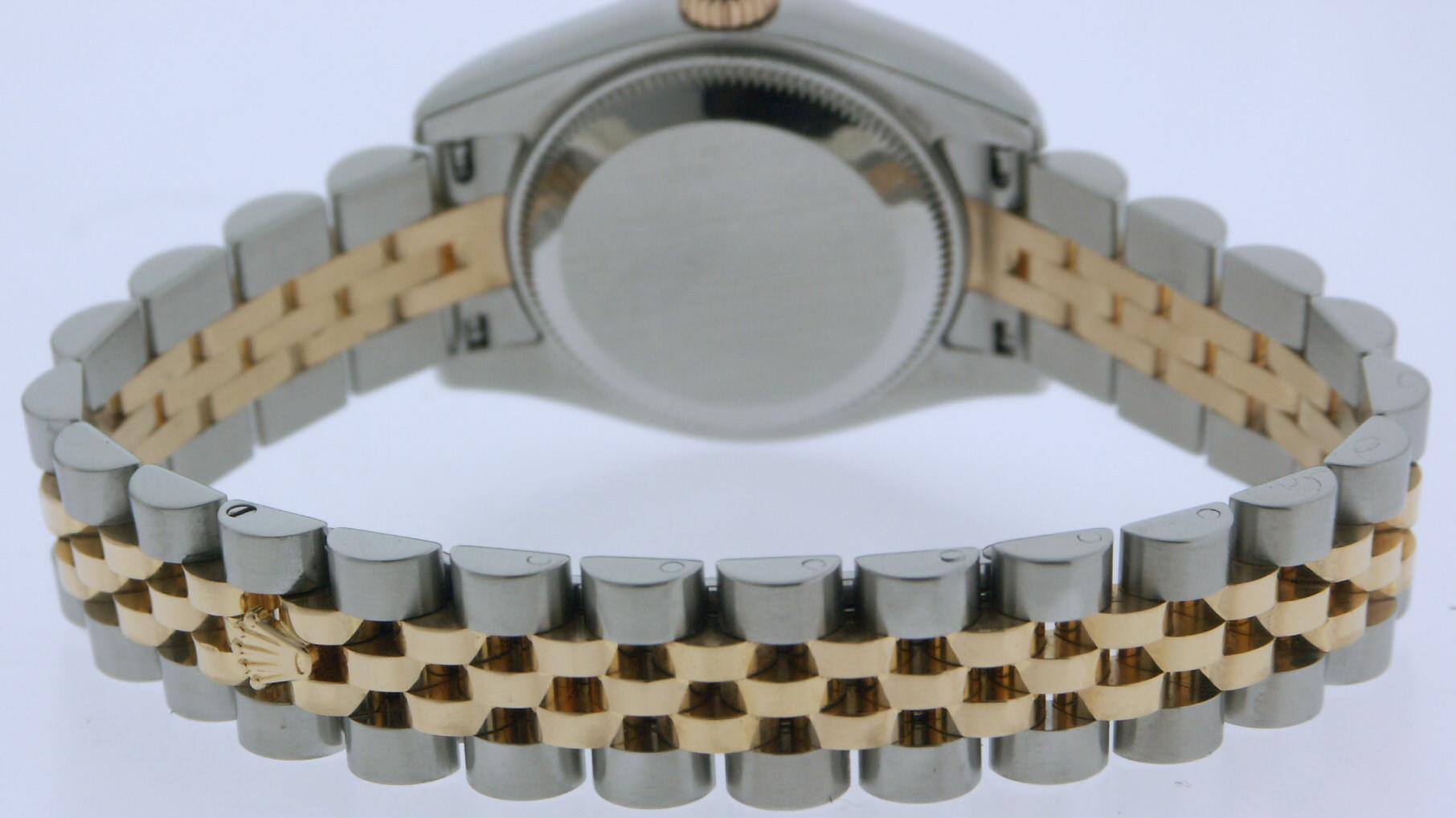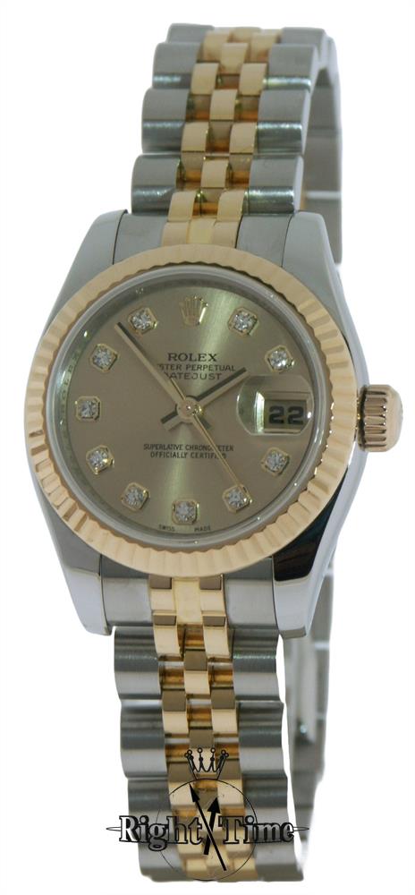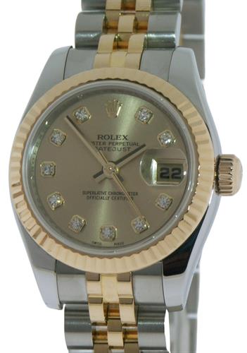 Ladies Rolex 179173 Oyster Perpetual "Datejust" Swiss made automatic model with 18kt yellow gold fluted bezel, new style 18kt gold and steel jubilee bracelet, champagne dial with factory diamond markers, serial number Z5557**, box and papers