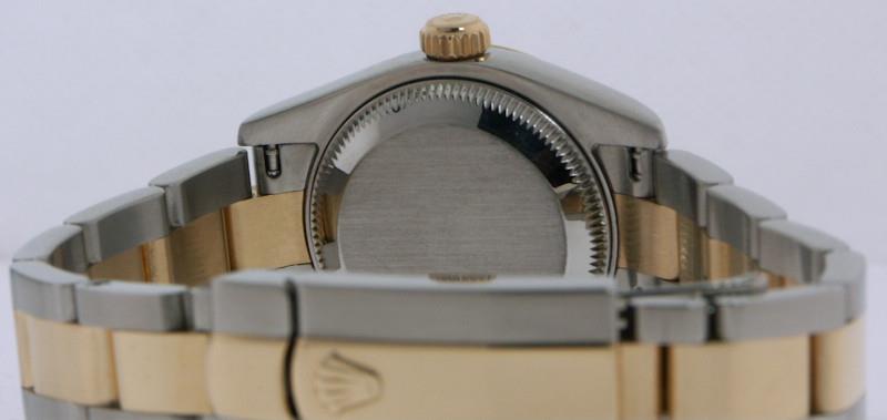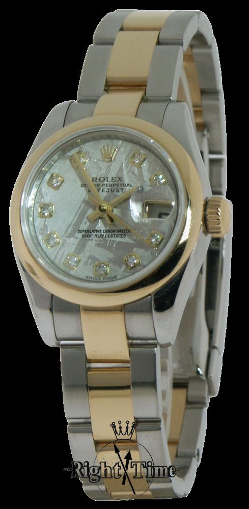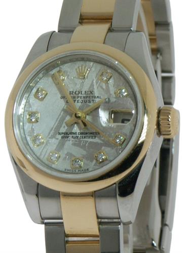 Rolex ladies 26mm oyster perpetual DateJust 179163 model. Diamond markers on Meteorite dial. Oyster style stainless steel and 18kt gold bracelet. Solid 18kt yellow gold bezel. Sapphire crystal. 31 jewel Swiss made Rolex Cal.2235 automatic movement.