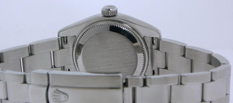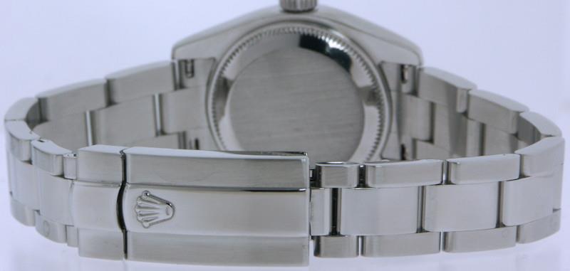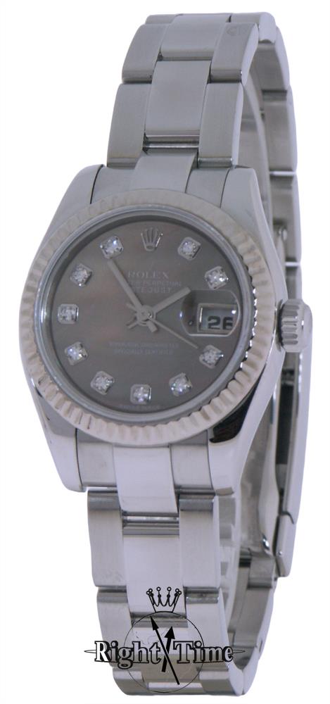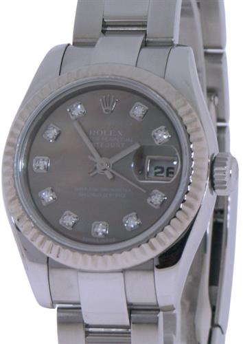 Rolex ladies 26mm oyster perpetual DateJust 179174 model. Factory Diamond markers on black color dial. Jubilee style stainless steel bracelet. Solid 18kt white gold bezel. Sapphire crystal. 31 jewel Swiss made Rolex Cal. 2235 automatic movement. Serial number D2850**