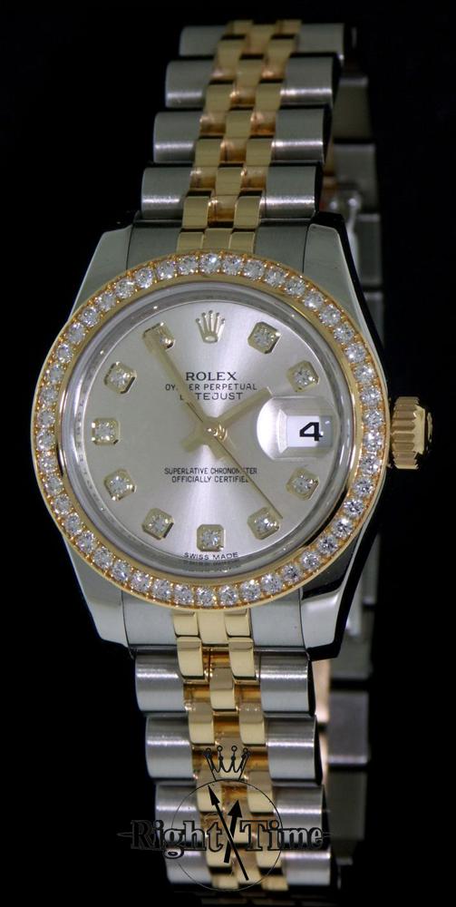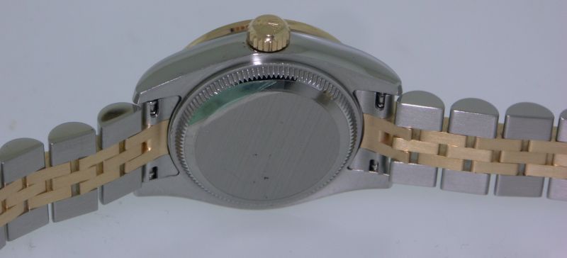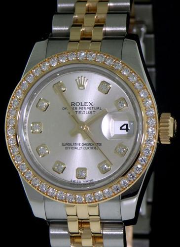 Ladies Rolex Oyster Perpetual Datejust 18kt gold and 304L stainless steel model 179383 with factory diamond bezel and factory set silver diamond bezel, box and papers, and tags 12/2012 .