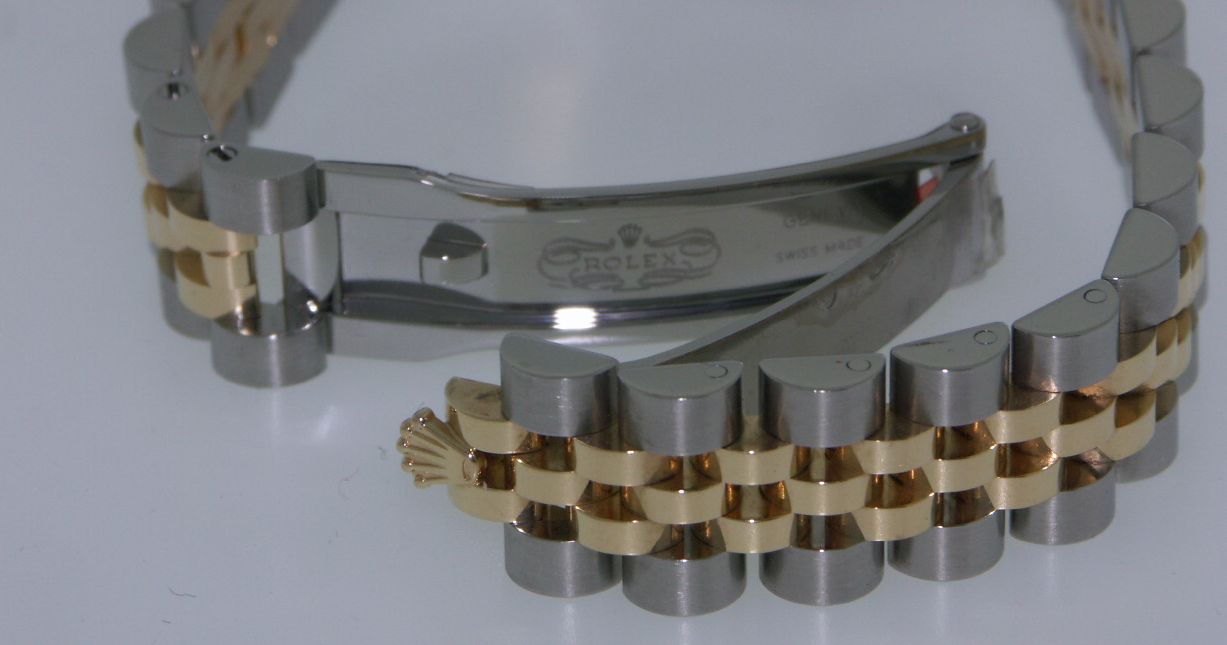 Jubilee style links. Solid Stainless steel and 18kt Gold combination. Combination satin/polished finish. All factory links are in.
