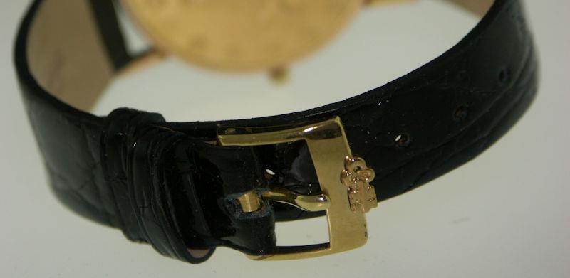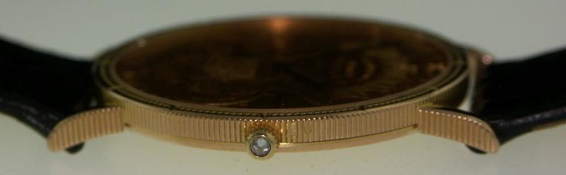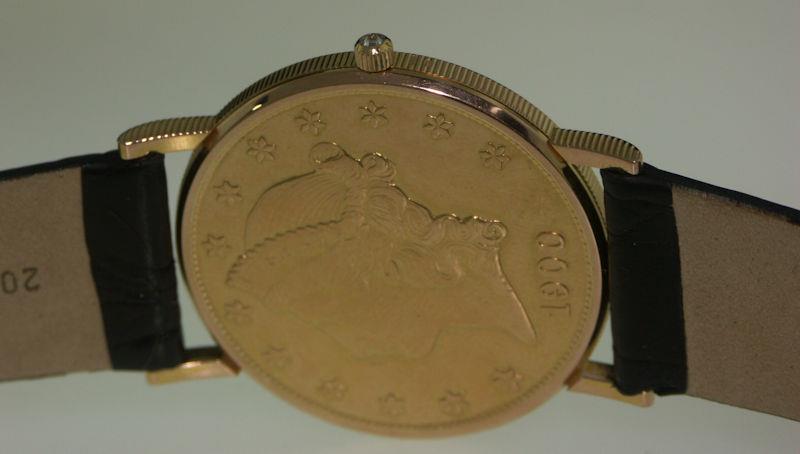 Corum Heritage Collection gold coin watch. The dial features an American Double Eagle with black hands, while the caseback has the head of Lady Liberty. The watch is literally cut from an original solid gold US Twenty Dollar coin, then the interior is machined to make room for the ultra-thin quartz movement. Comes on a black genuine crocodile strap.