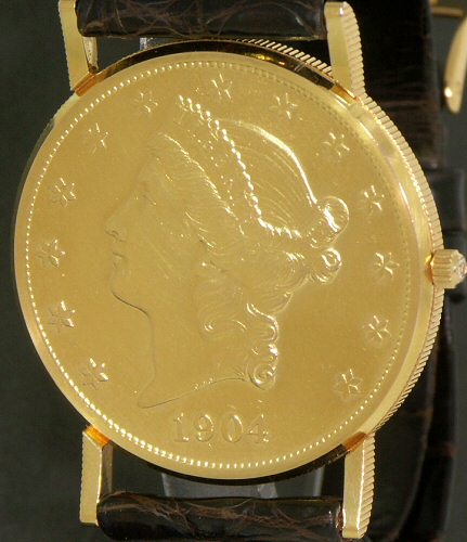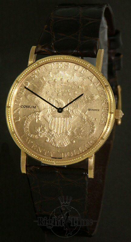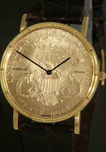 This Corum Heritage Collection Double Eagle on one dial side and Liberty Head on back Coin watch is uniquely made by Corum actually cutting the original solid gold US coin, machining it out on the inside and placing an ultra thin Swiss made ETA quartz movement inside. 35.0mm in diameter and only 4.0mm thin on original brown crocodile strap with box and papers.