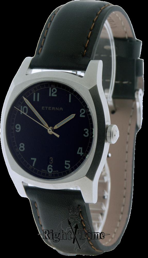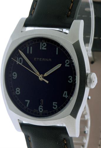 Eterna Heritage Military Limited Edition 1939 watch model 1939.41.46.1298. Inspired by a model from 1939, which was specially developed for pilots of the Czechoslovak Army: "Majetek Vojenske Spravy" (property of the military authority). Powered by Swiss automatic movement. Stainless steel case with leather band. Black dial with luminous hands and Arabic numerals. Date calendar at 6 o`clock position.