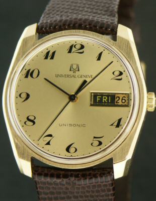 Timeless classic in solid 18kt yellow gold by Universal Geneve. This beauty is powered by Bulova patented tuning fork style movement Cal. 2182.