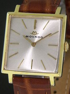 Movado Manual wind watch with 17 jewels. Movado Cal. 245. 20mic gold plated square shaped steel case. Brown leather watch strap.