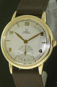 Men`s dress model Omega automatic, inside 14kt yellow gold filled case, powered by Swiss made 17 jewels Omega proprietary self-winding bumper style Calibre 28.10 RA, Omega signed crown, original dial