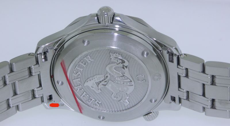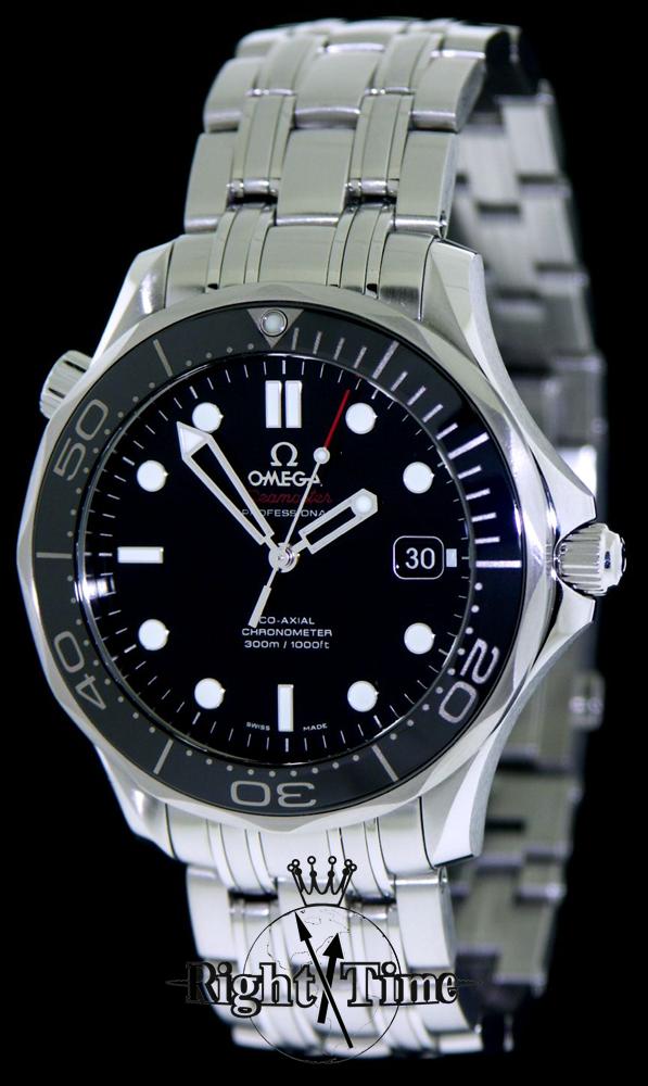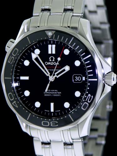 Omega Seamaster steel on steel with Omega Co-Axial Cal.2500 automatic COSC movement, model 212.30.41.20.01.003 with jet black dial, 300m water resistant, helium escape valve at "10", all stainless case and band, black ceramic insert in rotating bezel.