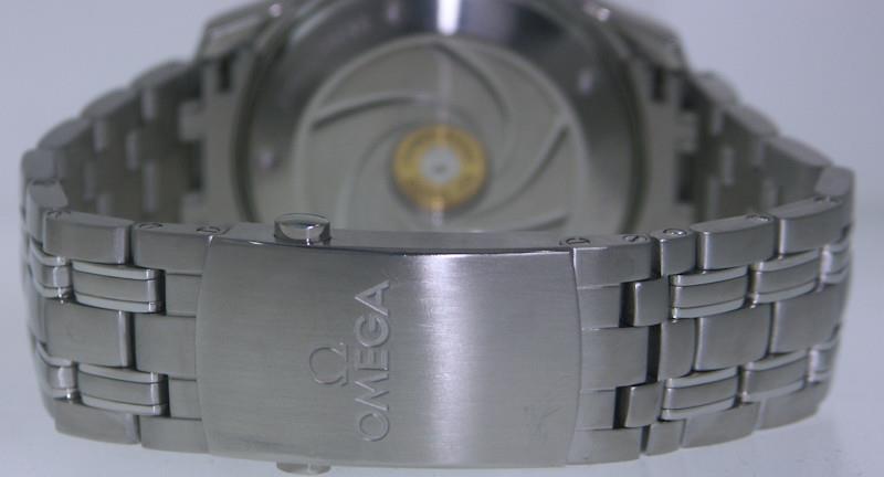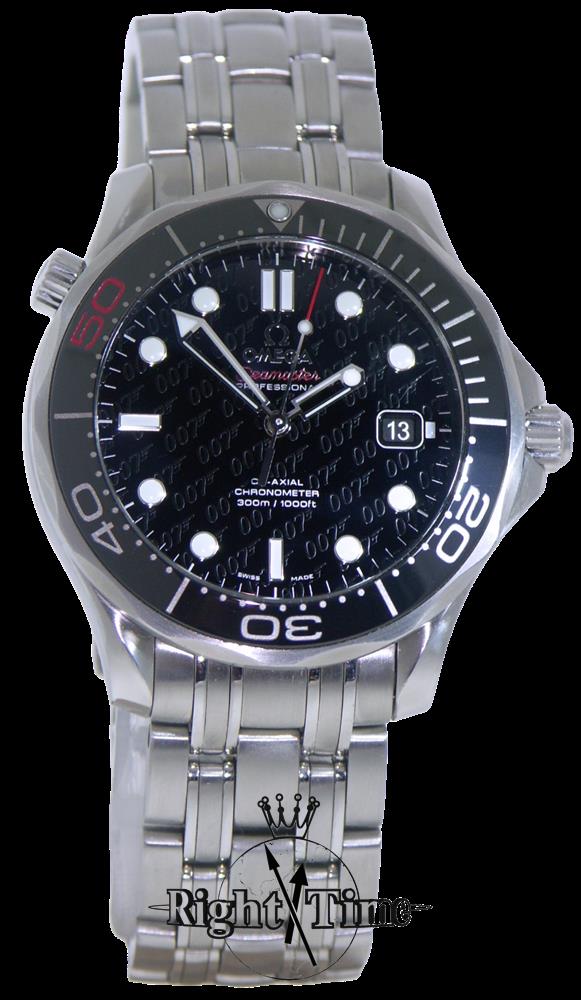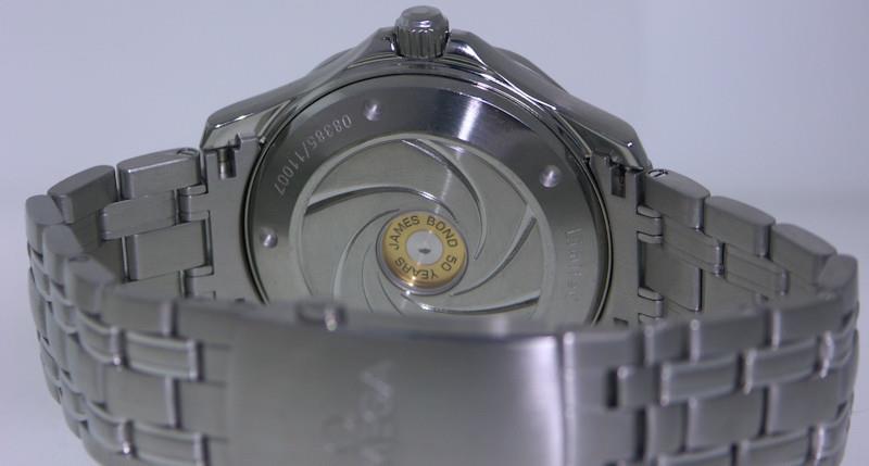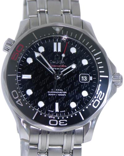 Omega Seamaster 50th Anniversary James bond limited Edition, all stainless steel case and bracelet, powered by Omega Co-Axial Cal.2507 automatic COSC movement, model 212.30.41.20.01.005 with jet black dial, 007 embosed the famous British agent, 300m water resistant, helium escape valve at "10", black ceramic insert in rotating bezel. Open caseback with gun barrel mockup on oscillating weight