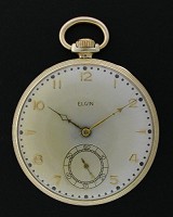 Elgin pocket watch powered by Elgin 17 jewels manual wind movement #542. Polished 10kt yellow gold filled open face case with plain back.