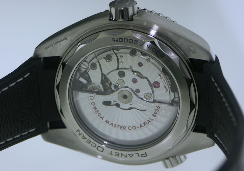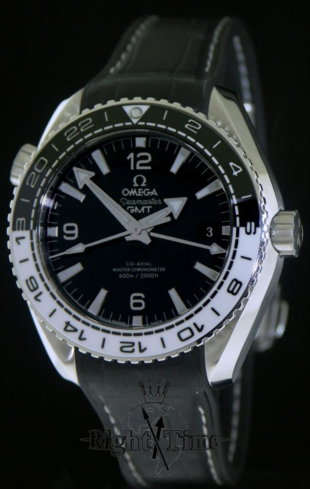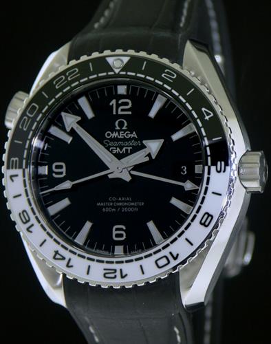 Omega Seamaster Planet Ocean factory model 215.33.44.22.01.001. Omega Master Chronometer calibre 8906 automatic movement with date and GMT function. Combination finished 43.5mm solid stainless steel case on a black leather strap with rubber lining and a push-button deployment buckle. Mirror black dial with steel tone markers and Arabic numerals. Duo-directional rotating bezel with black/white ceramic insert and 24 hour scale. Water resistant to 600 meters.