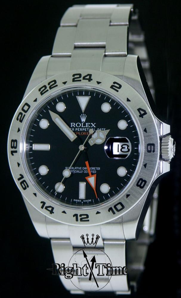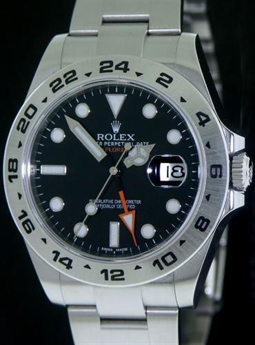 New style 42mm case Rolex Oyster Explorer II Date with GMT second time zone feature, calendar, window display. 31 jewel Rolex automatic movement. 904L solid stainless steel case and bracelet. Original box and papers, 08/2012