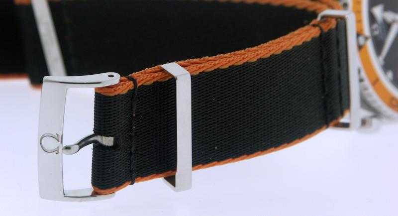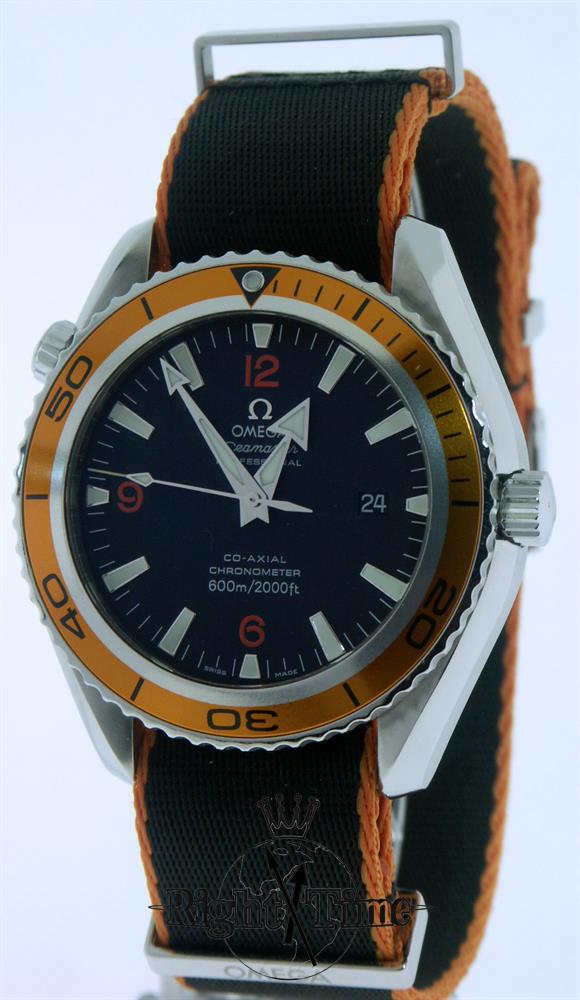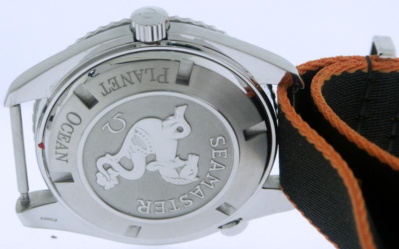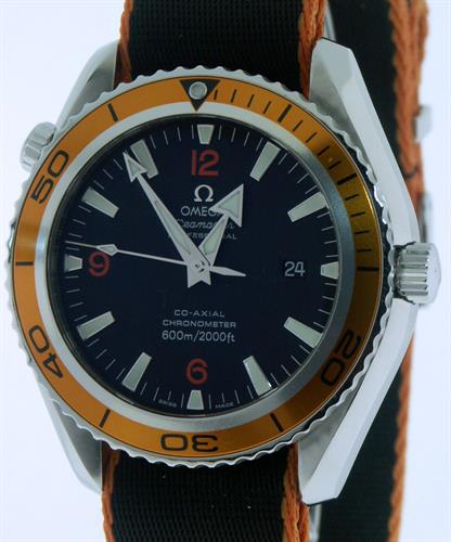 Omega Seamaster 45mm "Planet Ocean" 29085038 professional divers 600m model with orange rotating bezel and orange matching numerals numerals on dial, powered by automatic Co-Axial Omega Calibre 2500C, solid stainless steel case and Omega factory Nato style strap