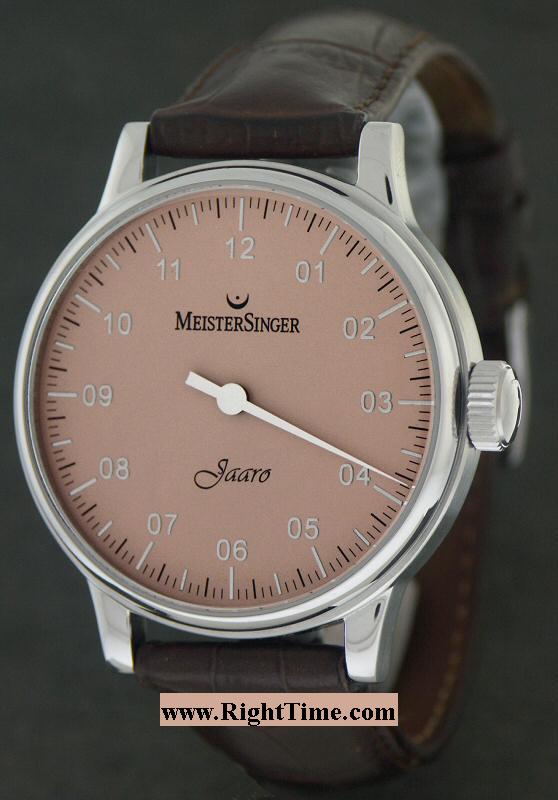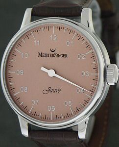 MeisterSinger single hand wrist watch from MeisterSinger Jaaro Series powered by Swiss Unitas 6497 Manually Wind movement with 17 jewels. Polished and satin finished stainless steel case. Sapphire crystal. Copper color dial with Arabic numerals and one hand that shows time in 5 minute increment. Leather watch strap. 30 meters water resistant.