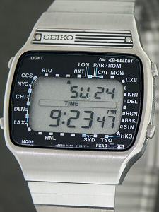 Seiko digital quartz watch with World Time and Alarm functionality. Stainless steel case and watch bracelet. Digital display.