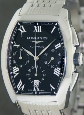 Longines chronograph watch from Longines Evidenza Collection. Swiss Automatic ETA 2894-2 chronograph movement with date calendar. Highly polished case and elegant flexible style bracelet