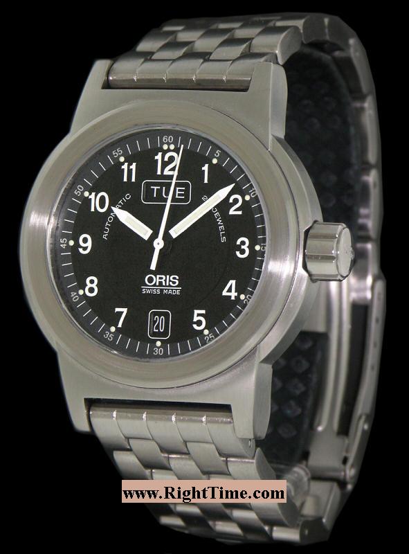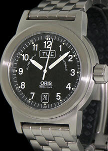 Oris 63575004164 automatic Day/Date 40mm case size wrist watch from Oris Big Crown BC3 Collection. Swiss ETA Automatic movement, stainless steel large case with Arabic numerals, luminous hands and markers on black color dial with day and date calendars, observation case back, stainless steel bracelet.