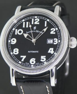 Swiss made automatic mechanical watch by Jacques du Manoir, powered by an ETA 2824-2 twenty-five jeweled movement in steel case with observation back
