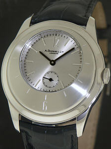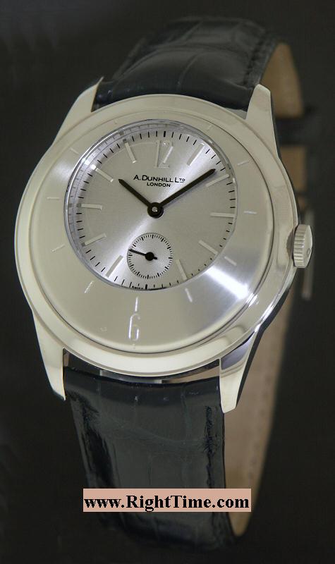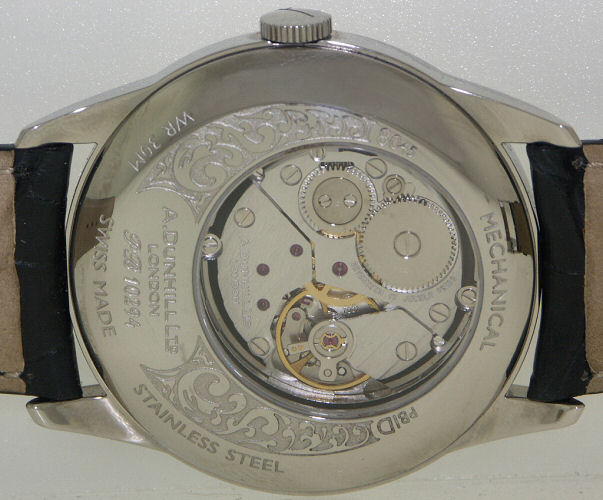 A. Dunhill of London created a very cool model 211AL with asymmetrically positioned movement inside a round case, a special mechanism had to be constructed inside to wind and set the ETA7001 manual wind movement 3mm below the center line of the movement, but in the middle of the case.
