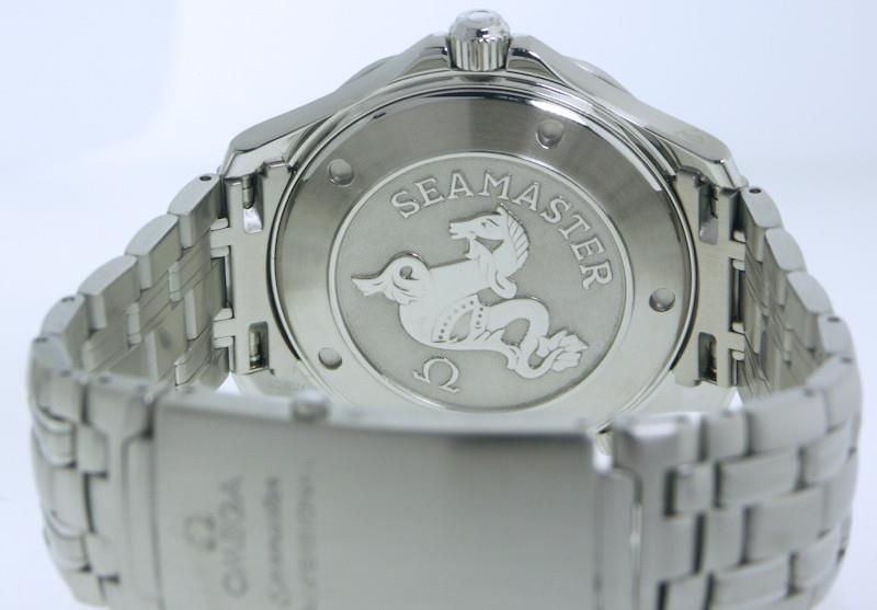 Blue color. Guilloche texture. Luminous ( radiation-free Super-LumiNova ) hour markers. Red Seamaster logo.