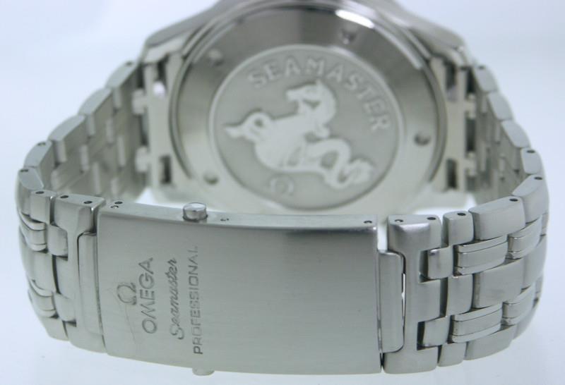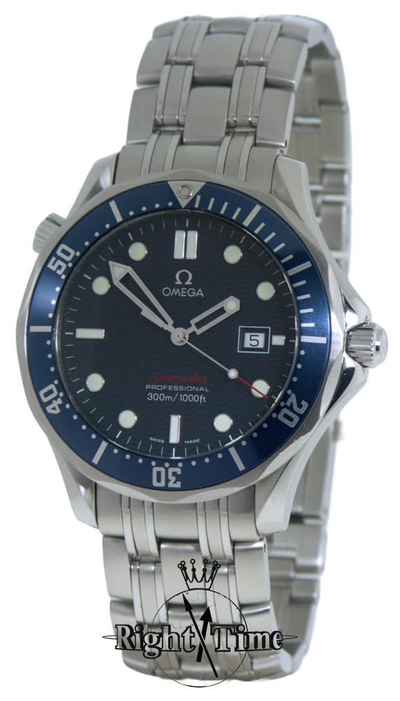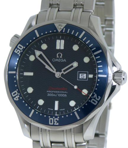 Famous Omega Seamaster "James Bond" style 300m divers quartz 2221.80.00 model with blue dial, featuring sea waive guilloche pattern and red Seamaster logo, oversized steel luminous hands, blue unidirectional 60 min divers rotating bezel, on stainless steel bracelet.