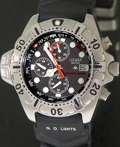 Citizen BJ2000-09E Aqualand Eco-Drive wrist watch with CITIZEN Rechargeable by light Eco-Drive Quartz chronograph movement. Underwater Depth Display up to 125 feet. Sandblasted finish solid 316L Stainless steel case with uni-directional 0-60 bezel, screw-down crown, black color dial with luminous 5 minute markers and date calendar. 200m water resistance. Rubber watch band with No Decompression (N.D.) Limits table printed on "6" part
