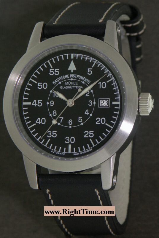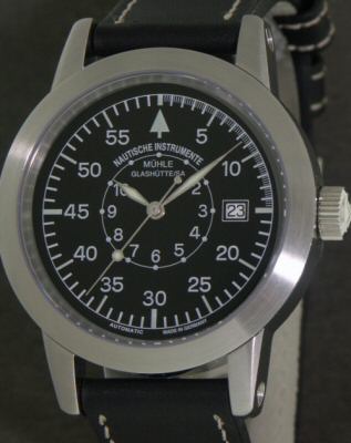 Muhle Glashutte German wrist watch from Muhle Glashutte "Gross" Sports M12 series with black "Aviator" style dial. Swiss ETA 2824-2 Automatic movement, over-sized solid 316L Stainless steel case with screw-down crown and case back, black dial with date calendar, Arabic numerals and luminous hands, black leather watch band.