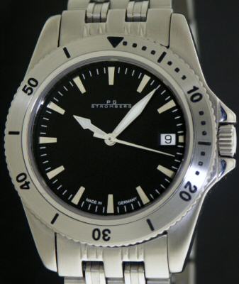 Made in Germany, PG Stromberg stainless steel sport watch with rotating bezel, powered by 25 jewels ETA 2824 automatic movement, black dial, large luminous hands, observation caseback.
