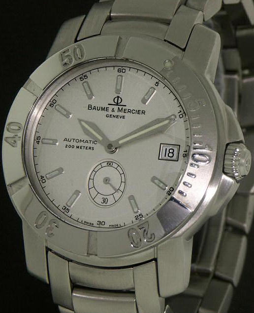 Baume & Mercier "Capeland" diver collection, model MOA08125 Swiss made automatic watch. Silver dial with applied polished markers. Oversized steel luminous hands. Heavy duty steel bracelet.
