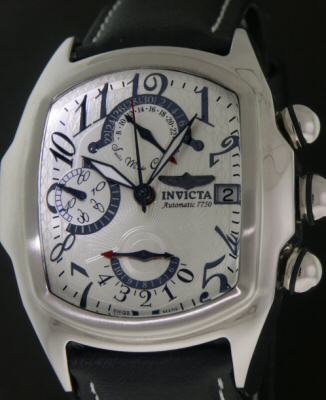 Invicta "Lupah" equipped with finely finished ETA Valjoux 7750 25 jeweled Swiss made automatic chronograph movement in gigantic satin/polished stainless steel case, blued numbers on silver satin guilloche textured dial, domed bubble crystal