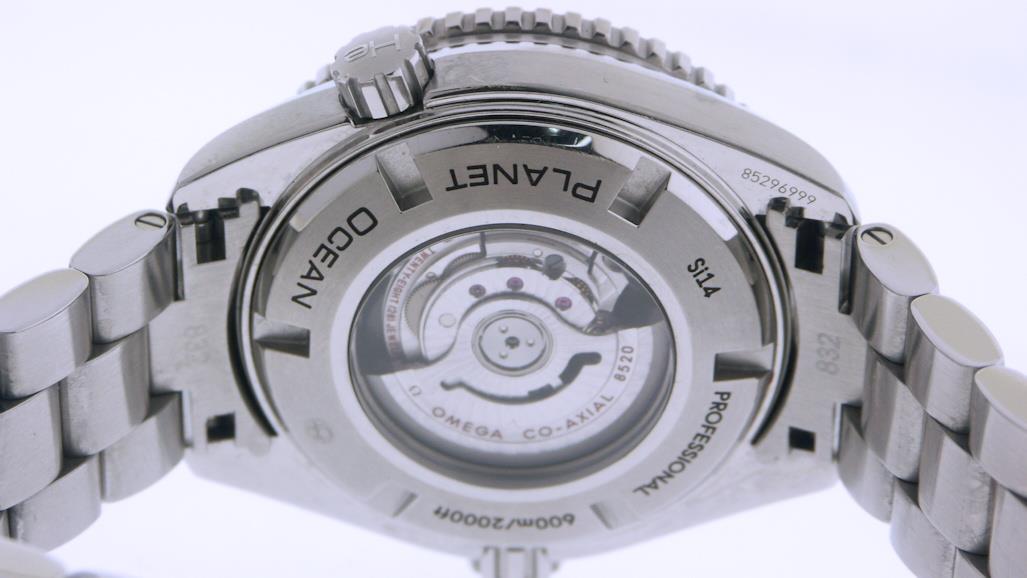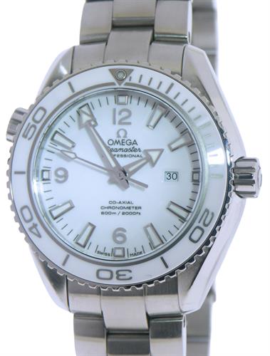 Omega Seamaster "Planet Ocean" mid-size factory reference 232.30.38.20.04.001. Professional 600meter diver in a modern 37.5mm solid stainless steel case with stainless steel bracelet. Uni-directional rotating bezel with white ceramic 0-60 minute insert. White dial with polished steel markers and hands. Omega Calibre 8520 automatic movement with co-axial escapement.