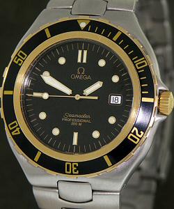 Omega Seamaster Professional 200 Meter Dive Watch. Omega quartz movement, brushed stainless steel case and watch bracelet, 18KT solid gold uni-directional 60 minutes bezel, screw down crown and case back, black dial with date calendar and luminous hands and markers. Serial #540039**