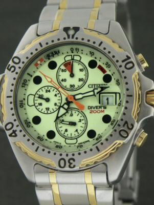 CITIZEN AY5024-07W Aqualand model. Date calendar, window display with magnifier. Underwater Depth Display up to 125 feet. 50 minute recorder chronograph. Reverse black markers on green luminous dial. Citizen diver steel band