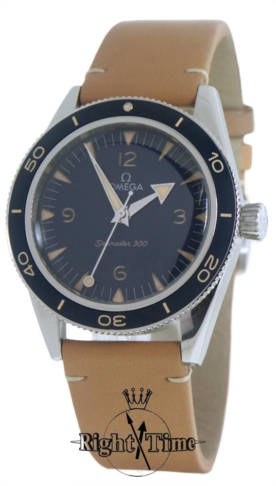 Omega Seamaster 300 factory model 234.32.41.21.03.001. Solid stainless steel case with domed sapphire crystal and uni-directional blue bezel insert. Observation caseback displays the Omega Calibre 8912 master Co-Axial automatic movement. Certified COSC chronometer. Blue sandwich style dial with vintage color lume. Tan leather strap with factory tang buckle. Water resistant to 300 meters.