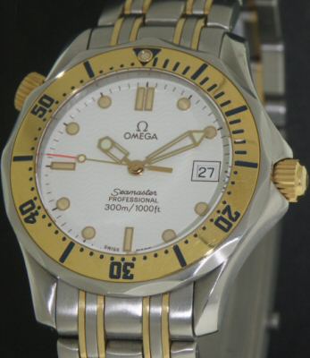 Omega Seamaster professional 300m water resistant, mid-size, Swiss quartz, 18KT gold and steel combo band and rotating bezel, ivory waive pattern dial, box and papers