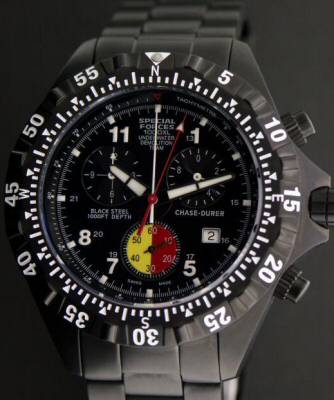 44mm case Chase-Durer 246.4BB7-XL-BR Special Forces 1000 XL Underwater Demolition Team Chronograph watch for elite fighting forces. Swiss made chronograph with 27 jewels Swiss ETA 251.262 quartz chronograph movement with date calendar, black PVD solid 316L stainless steel case, unidirectional bezel with 0-60/360 degree compass heading marker, screw-down crown with shoulder guard, black color dial with Superluminova illumination system on hands and Arabic numerals, black PVD solid 316L stainless steel watch bracelet with expendable, double lock security clasp. 300m water resistance. Serial numbered.