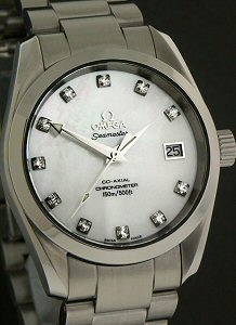 Omega Seamaster Aqua-Terra Railway 2504.75, mid-size 36.2mm stainless steel case, fitted with famous co-axial escapement certified chronometer grade Omega Calibre 2500 27jewel movement, with scuttle mother-of-pearl dial and diamond set markers, observation back.