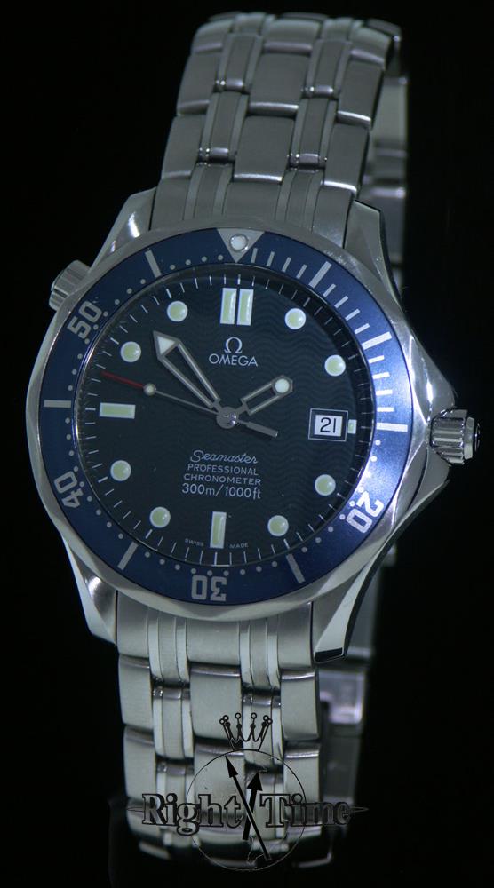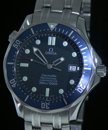 Omega Seamaster 2531.80.00 with blue waive pattern dial, the famous "James Bond" style that was worn by James Bond in five Bond movies starting with 1997 Tomorrow Never Dies. Automatic movement COSC, 300m water resistant, helium escape valve at "10", all stainless case and band, blue insert in rotating bezel.