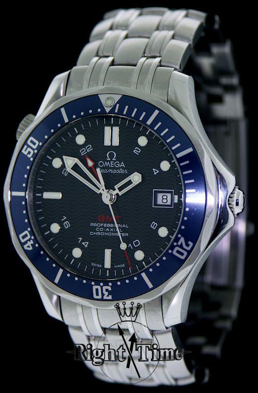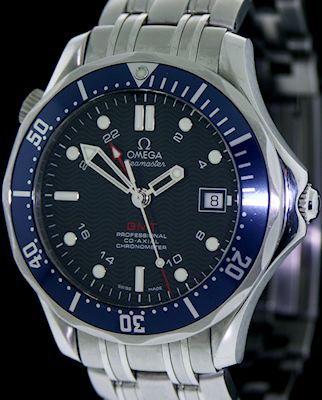 Omega Seamaster with Co-Axial 2628B GMT movement, model 2535.80.00 with blue waive pattern dial, the famous "James Bond" style that was worn by James Bond in five Bond movies starting with 1997 Tomorrow Never Dies. Automatic movement COSC, 300m water resistant, helium escape valve at "10", all stainless case and band, blue insert in rotating bezel.
