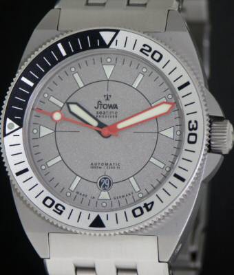 Stowa Seatime Pro-diver made in Germany. 1000m water resistant sandblasted finish scuba diver automatic watch with speckled grey dial black and orange extra large luminous hands. Comes in a factory metal box with original rubber replacement band.