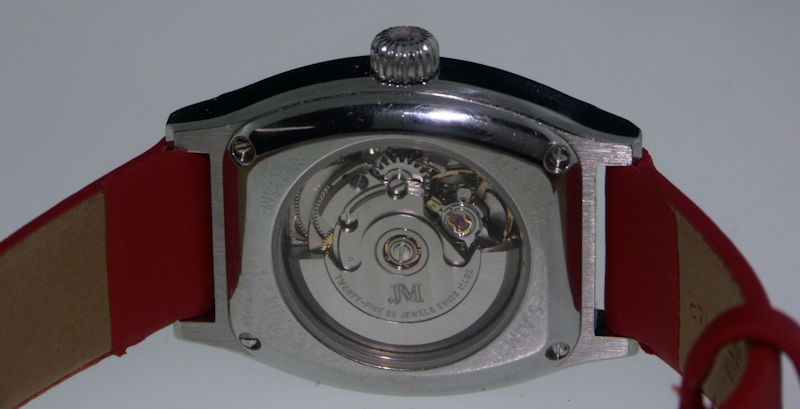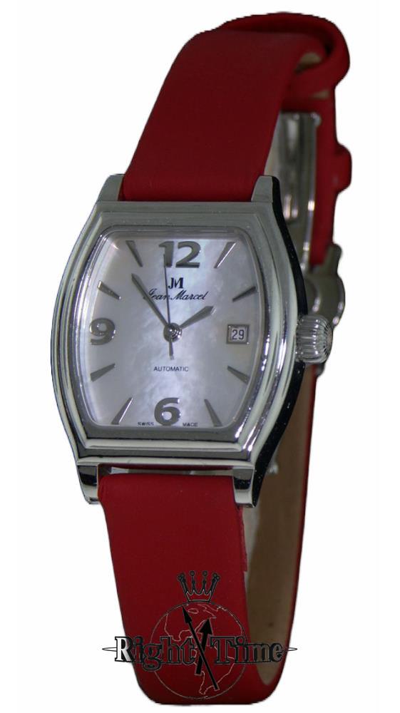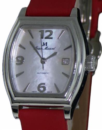 Jean Marcel Ladies wrist watch from Jean Marcel Gravis Collection. Swiss ETA Automatic movement Cal.2671 with 25 jewels. Genuine Mother-of-Pearl dial with Date calendar. Solid Stainless steel tounneau shaped case with sapphire crystal and observation case back on red leather strap.