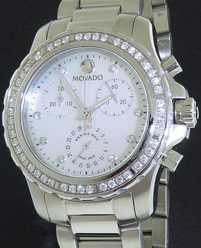 Movado Series 800 watch for ladies model 2600129. Swiss quartz chronograph movement with pointer date. Stainless steel 35mm case with 43 diamonds on the bezel, white Mother-of-Pearl dial, diamond markers, stainless steel bracelet. Water resistant to 200 meters